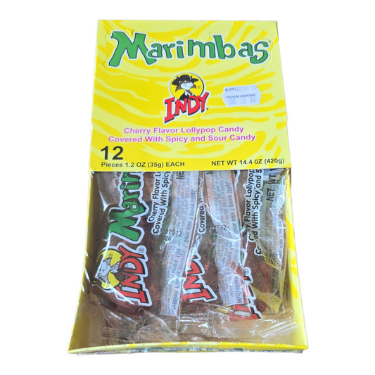 Indy Marimbas Cherry flavor lollypop candy covered with spicy and sour candy 12-pc Net Wt. 14.4-oz